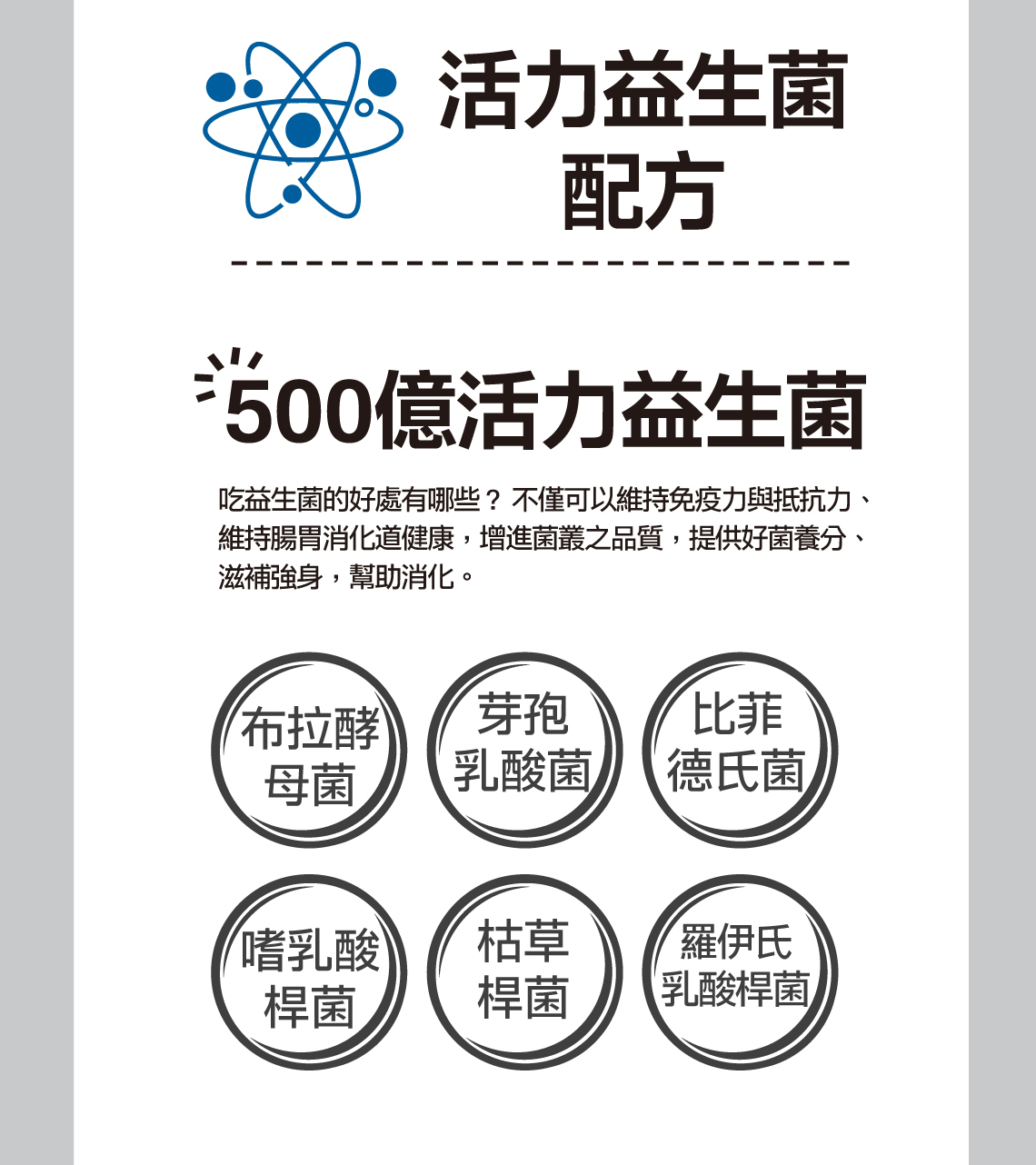 成分 : 益生菌(布拉酵母菌、嗜乳酸桿菌、羅伊氏乳酸桿菌、芽孢乳酸菌、比菲德氏菌、枯草桿菌)500億CFU