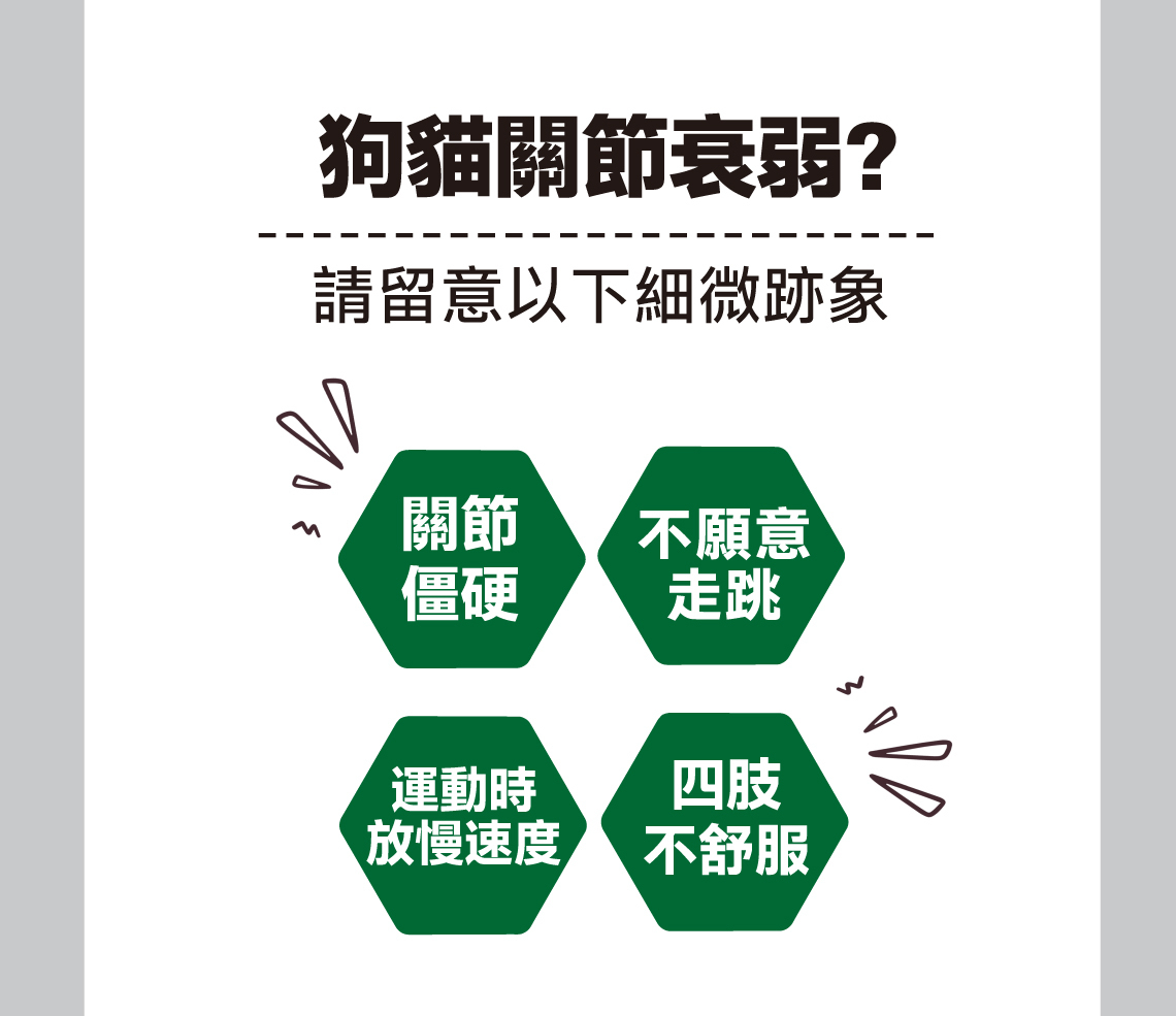 ❶玫瑰果、薑黃素、VetPerine™專利胡椒鹼,三合一黃金關節配方,保護關節穩固有力