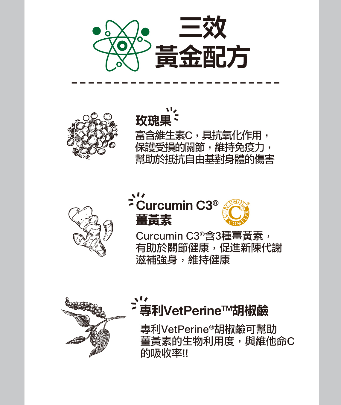 玫瑰果、薑黃素、VetPerine™專利胡椒鹼,三合一黃金關節配方,保護關節穩固有力