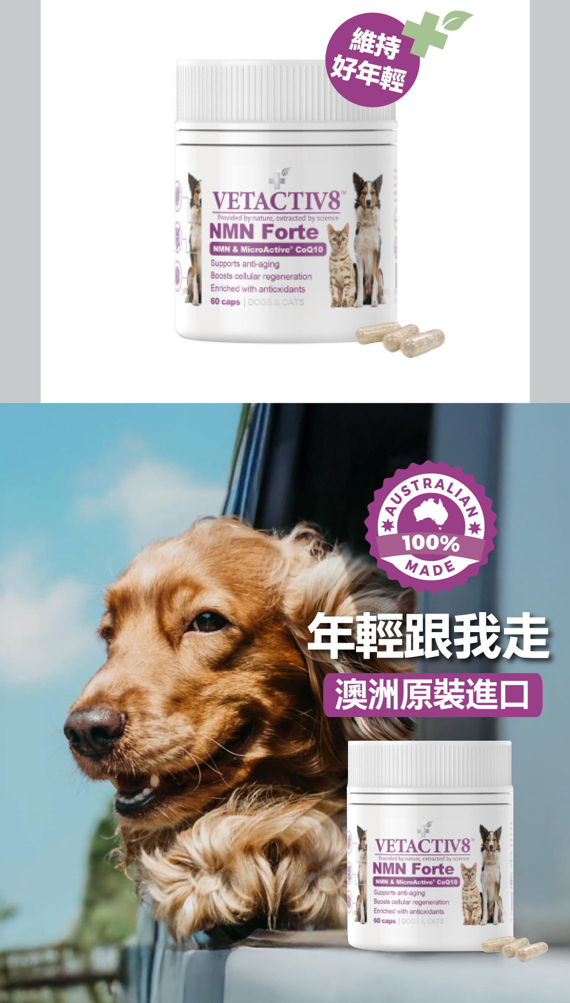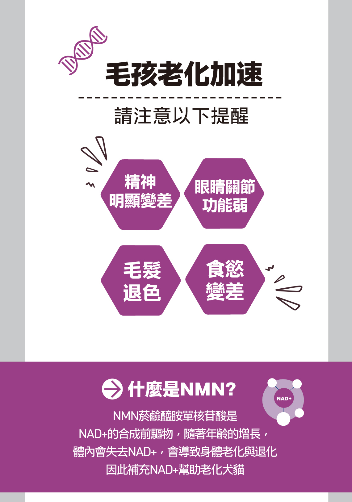 ❶NMN 能幫助維持年輕健康狀態,含有 >99.9% 的純煙酰胺單核苷酸(NMN) 與雲芝萃取,幫助抵抗自由基對身體的傷害,維持免疫力、讓寵物陪你更久更健康
