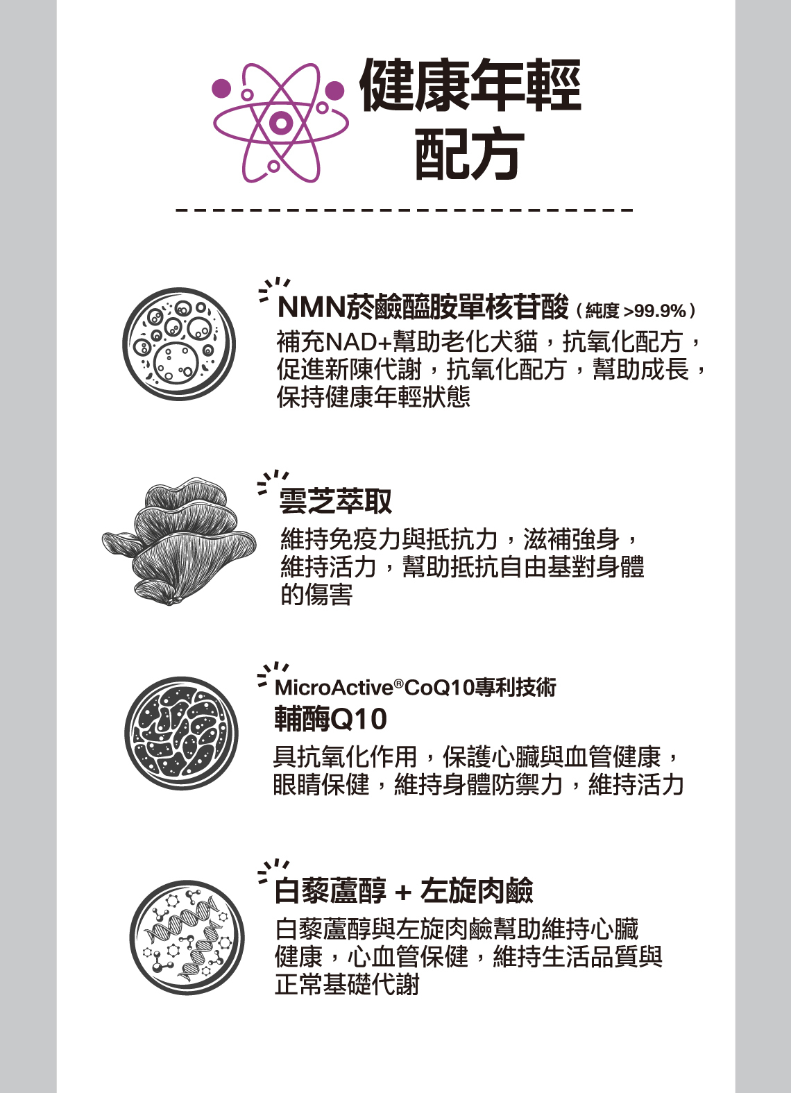NMN 能幫助維持年輕健康狀態,含有 >99.9% 的純煙酰胺單核苷酸(NMN) 與雲芝萃取,幫助抵抗自由基對身體的傷害,維持免疫力、讓寵物陪你更久更健康