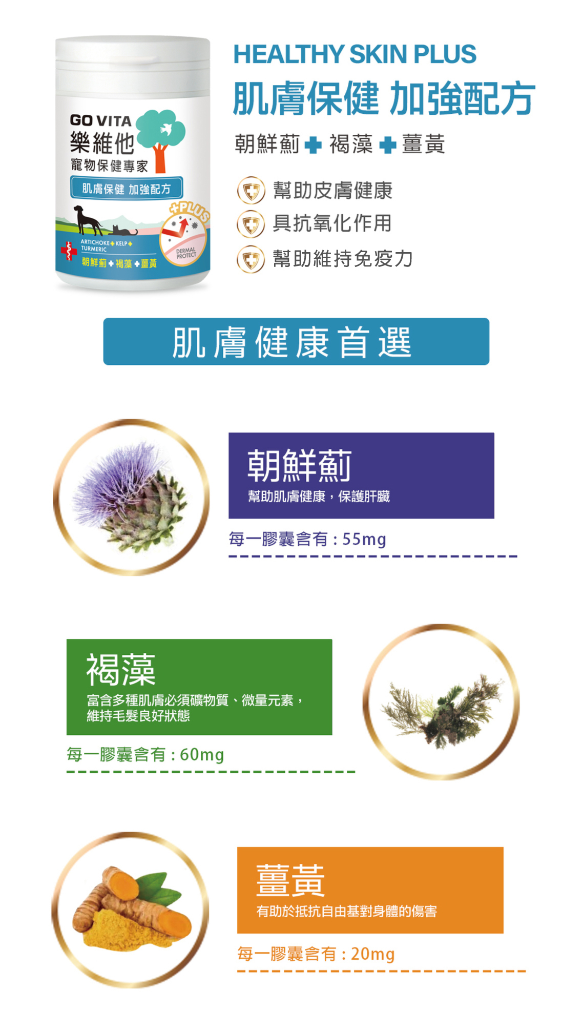 肌膚保健新升級配方,朝鮮薊 + 輔酵素Q10 + 褐藻 + 乳酸片球菌 + 薑黃 5大超級成分,幫助肌膚健康,幫助維持免疫力,具抗氧化作用。