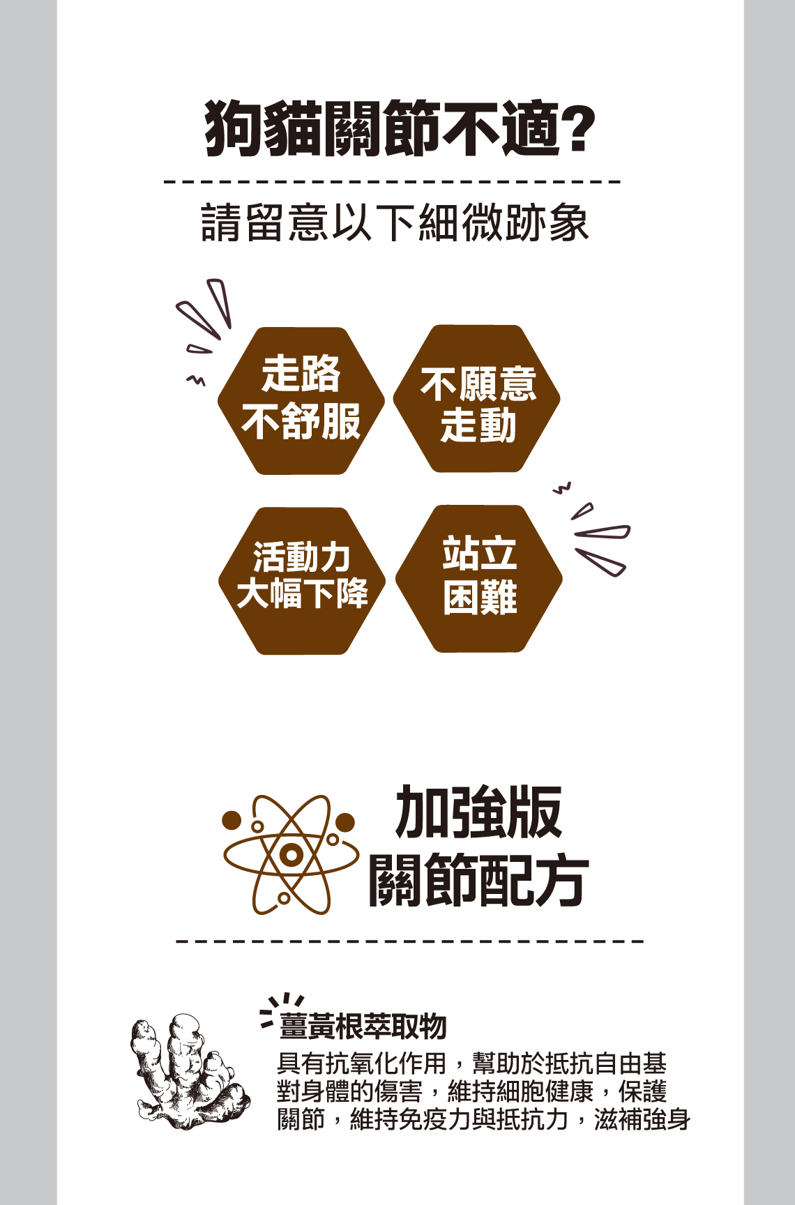 ➋推薦給重度關節狀況、跛行、不願起身、活動能力下降、精力不足的寵物。